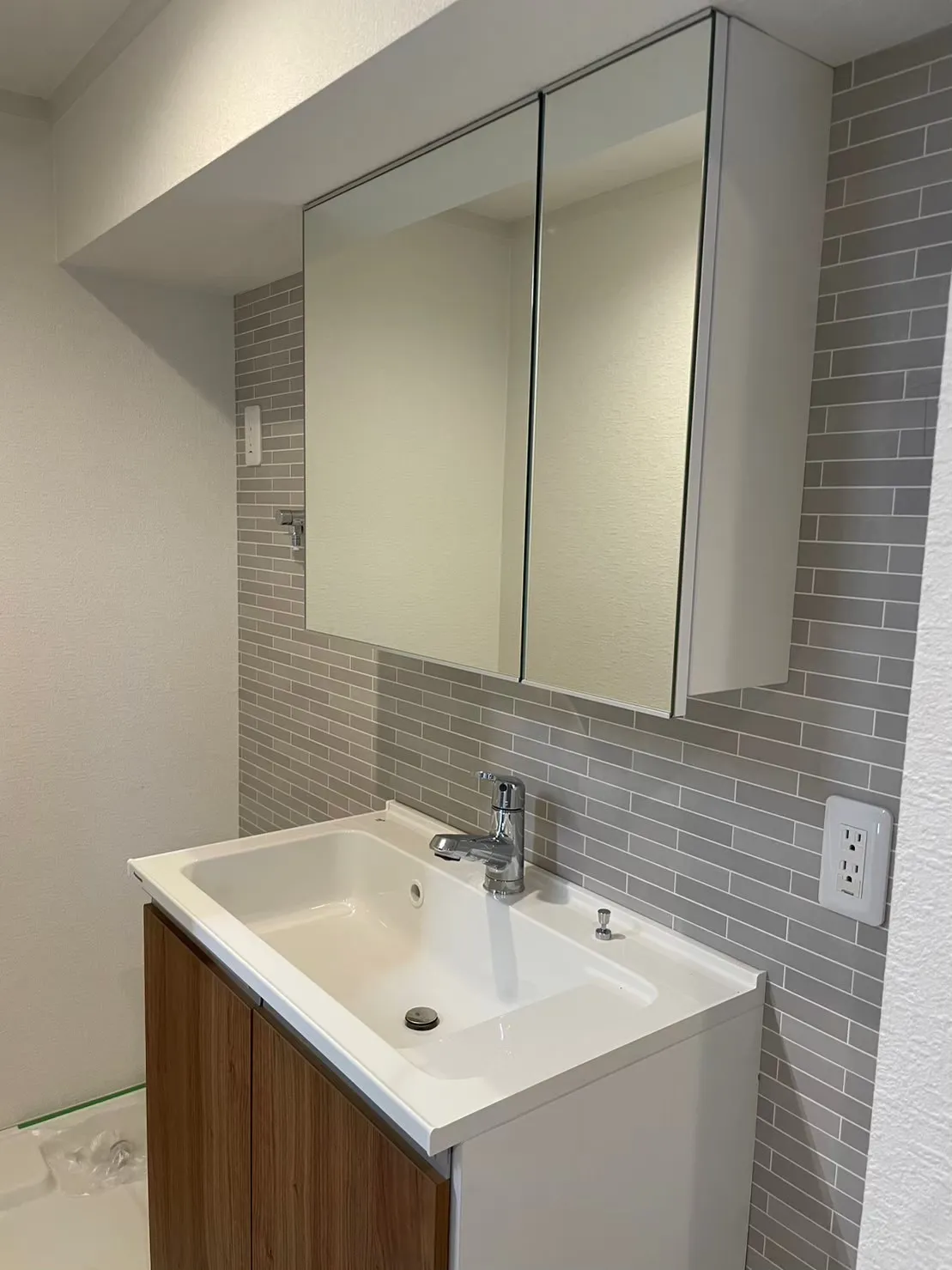 洗面スペースにはグレーをアクセントに、清潔感と上質さをプラスしています。
